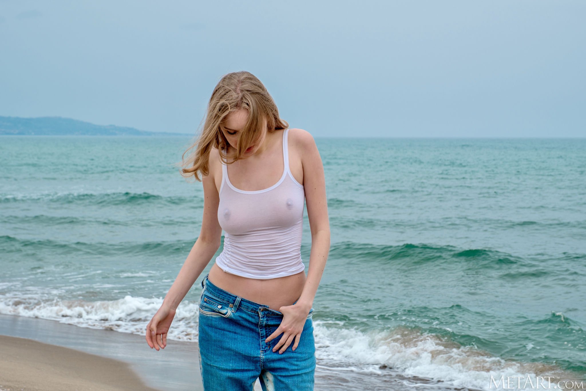 Blonde with firm tits spreads her ass and pussy at the beach from