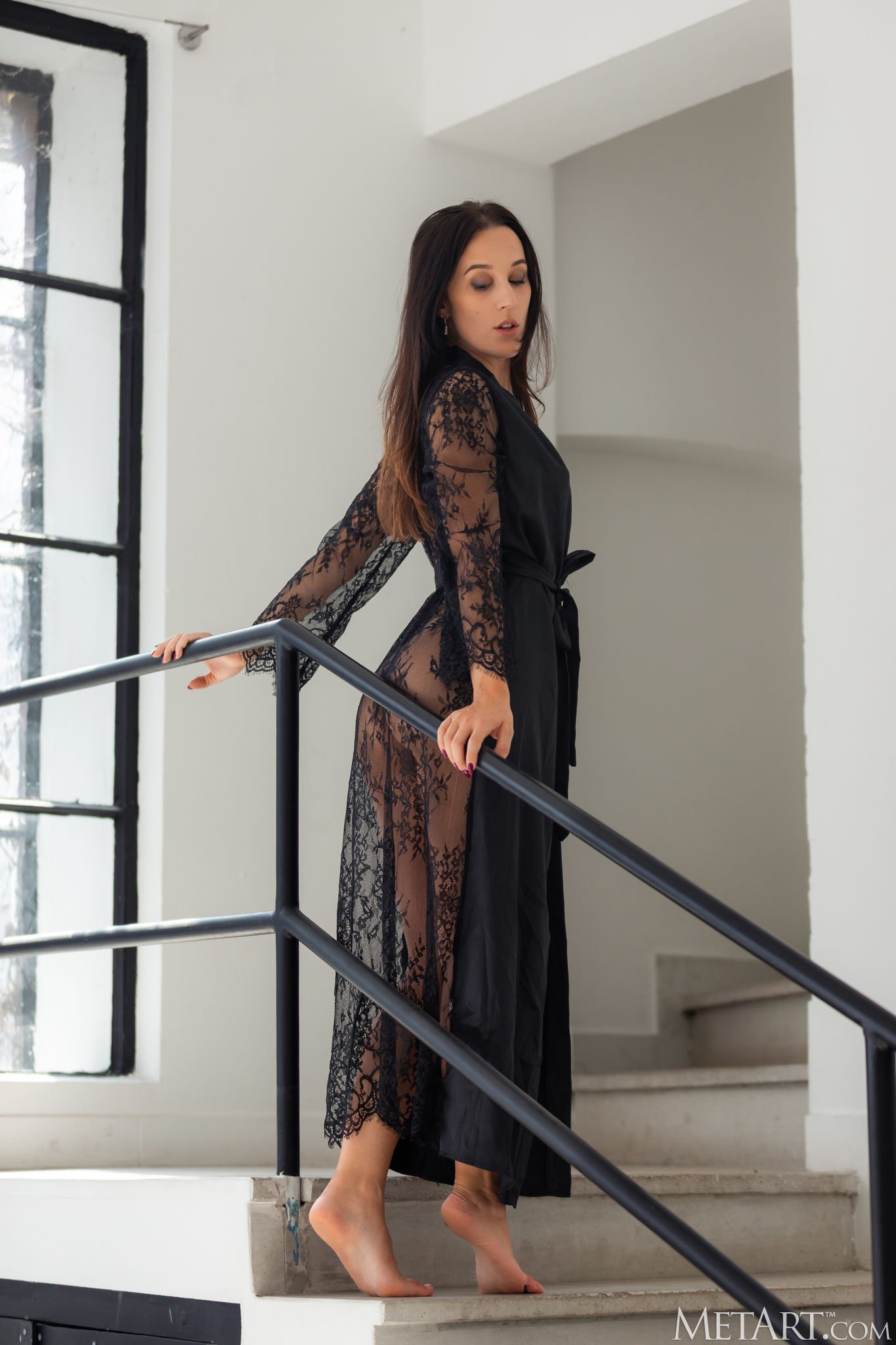Athletic brunette takes off her see-through robe in the staircase from